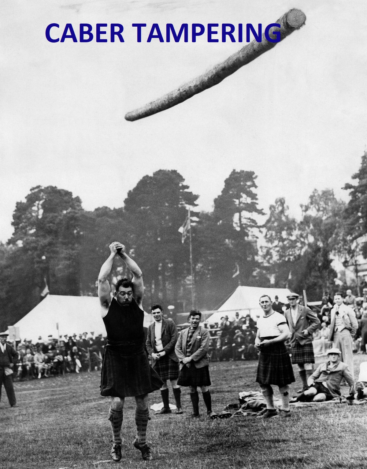 Banchory Royal Highland Games 1936. Scandal as Alisdair Farquharson, the King’s Chief Tosser, is caught smearing treacle-laced oatmeal on his caber to improve his grip.
